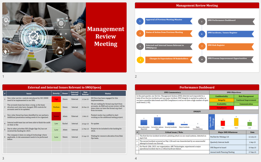 The Management Review Meeting offers a formal platform to evaluate your ISMS performance. It enables leadership to review objectives, risks, audit findings, incidents, and improvement actions. With ready-to-use templates like the Management Review Agenda and Minutes of Meeting, you can ensure every discussion is structured, documented, and aligned with ISO 27001 requirements -helping you strengthen your security posture and maintain ongoing compliance.