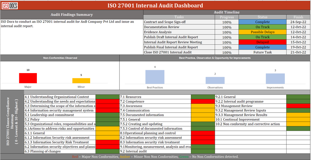 The Internal Audit Dashboard provides a visual summary of audit progress, compliance status, and corrective actions across your ISMS. Paired with essential templates like the Annual Audit Program, Audit Calendar, Internal Audit Plan, Checklist (Excel), Non-Conformity Reports, and Corrective Action Procedures, it helps you manage end-to-end audit activities with clarity and control. Everything you need—from planning to reporting—is included to ensure a smooth, audit-ready process.