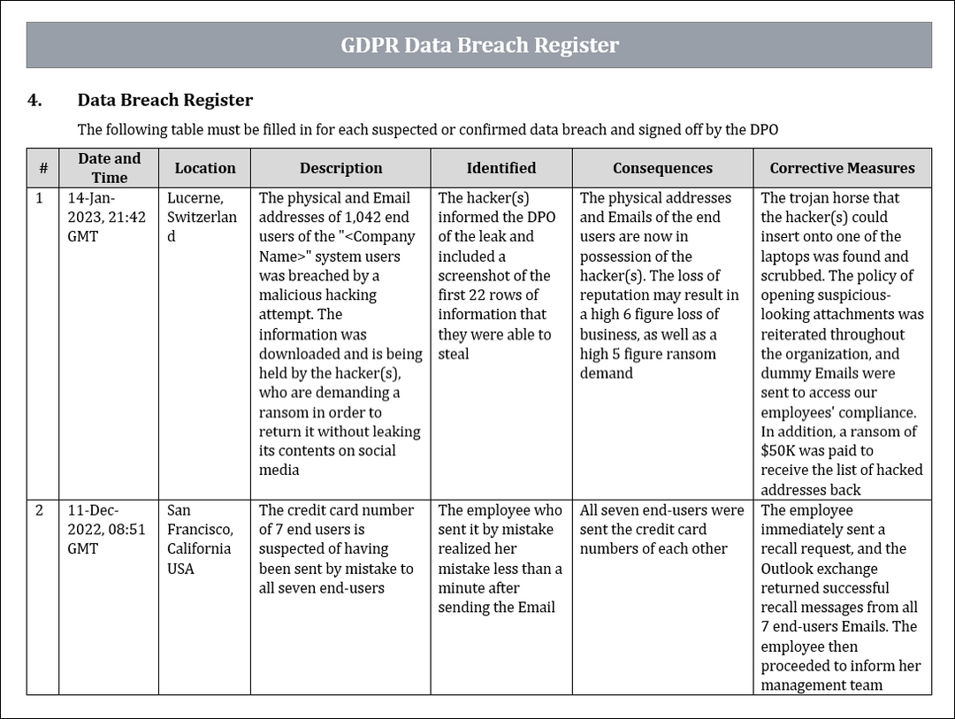 Our GDPR Data Breach Register Template provides a structured framework for recording and managing data breaches in compliance with regulatory requirements. It includes essential fields such as breach details, impact assessment, and corrective actions taken.